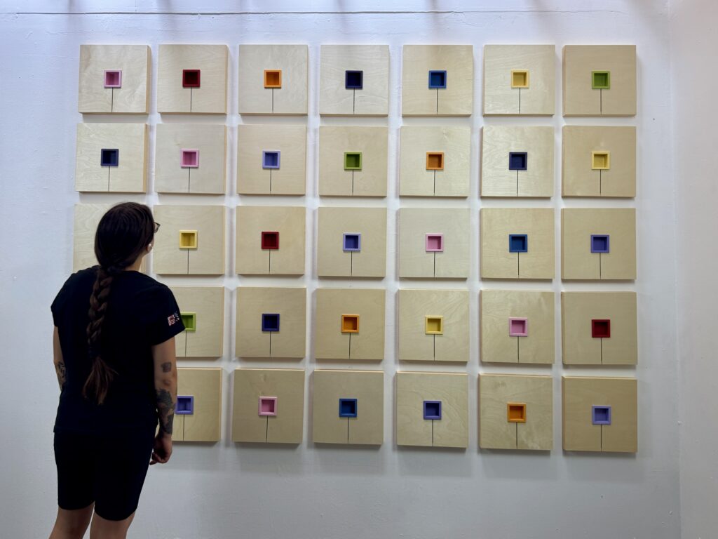 We All Need Flowers. This piece offers a moment of calm and joy amid life’s chaos. Bright colors and simplified floral forms create a cheerful pause, like stepping into a field of blossoms. The open-box flowers serve as symbolic vessels, inviting you to set down your burdens. The work provides open spaces in the form of flowers for emotional release.