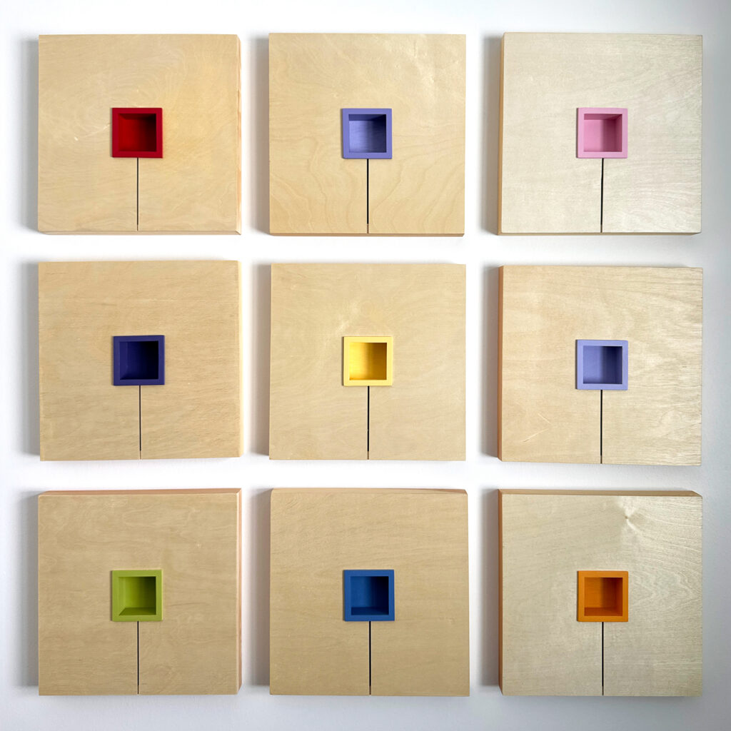 Each piece begins with observation and unfolds through a deliberate process of composition. Working with wood and color, I cut, layer, and assemble until form and feeling excite each other. The works are intentionally restrained and meant to create space for you to breathe and find hope.